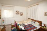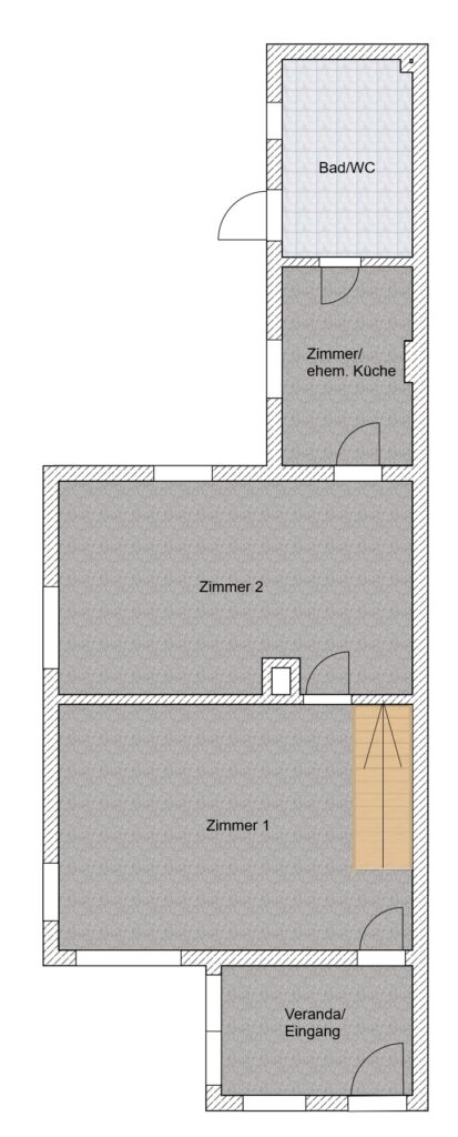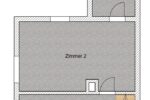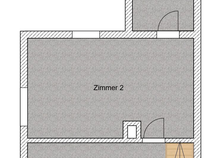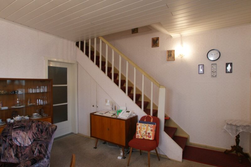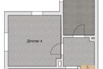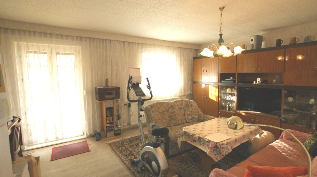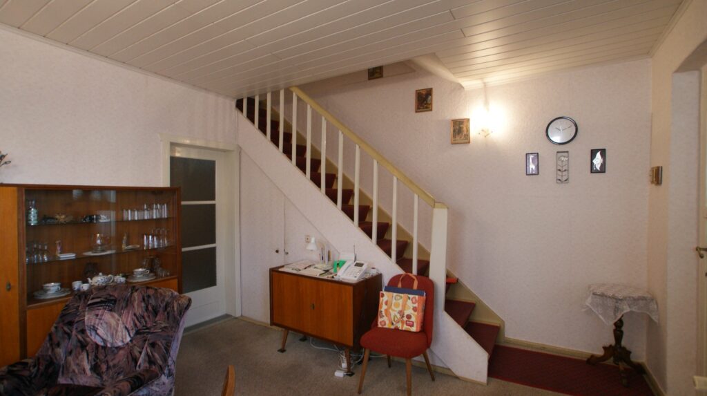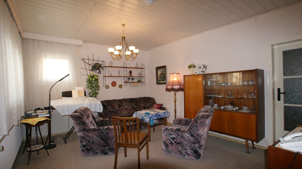 Daran angrenzend steht ein weiterer Raum zur Verfügung, der bisher als Schlafzimmer genutzt wurde. Eine Zusammenlegung der beiden Räume durch Öffnung oder Herausnahme der Innentrennwand erscheint möglich, sollte aber vorab statisch geprüft werden.
