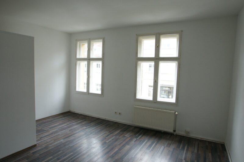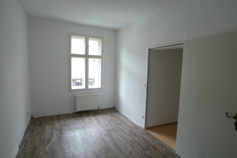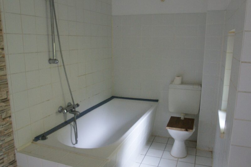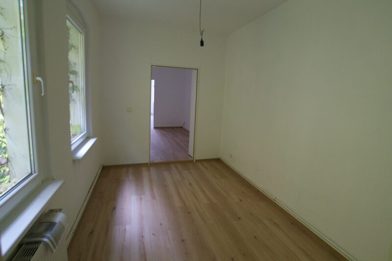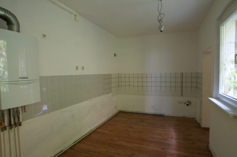 Die große Wohnung im 1. Obergeschoss steht derzeit leer. Sie wurde vor einigen Jahren bereits nach damaligem Standard renoviert. Neben Einbau einer Gasetagenheizung, Instandsetzung der Elektroanlage sowie Neugestaltung des Badezimmers wurden teils Isolierglasfenster verbaut und die Bodenbeläge erneut.