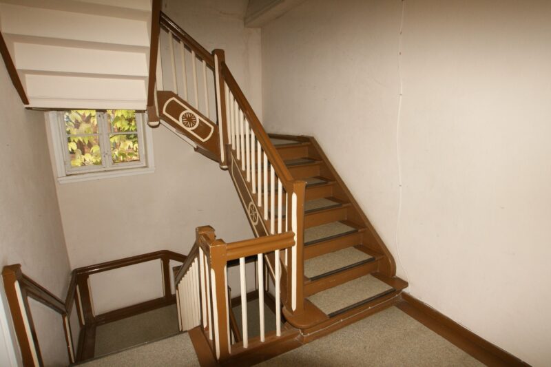 Das Haus wurde in massiver Bauweise errichtet. Das Treppenhaus erscheint weitestgehend noch im Originalzustand, es bietet einen Zugang in den Keller des Hauses. Hier sind die Hausanschlüsse untergebracht.